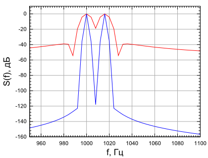 Окно Хемминга при 1024-точечном БПФ (без полифазной обработки), и максимально-плоское окно при полифазном БПФ на 4096 точек.