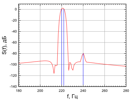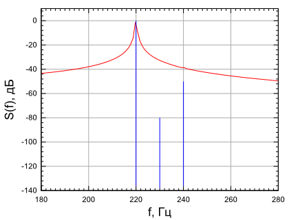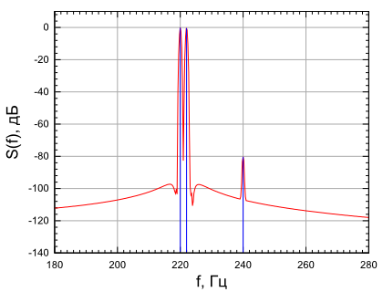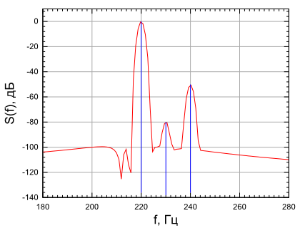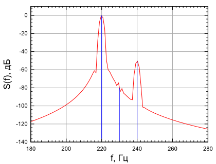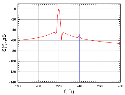 Остальные гармоники на частотах 230 Гц и 240 Гц скрыты боковыми